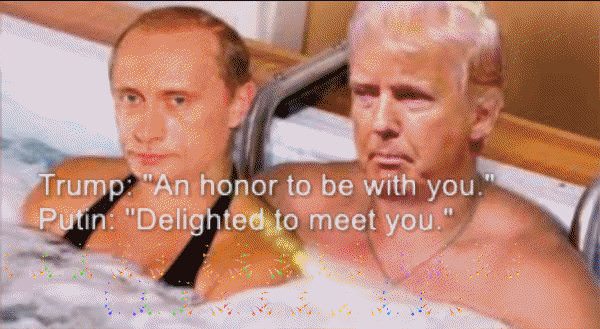 Vladimir Putin has his hands on Trump’s balls like a vice-grip. Trump’s “dubious” business career has put Trump in Putin’s paws. Putin – the former head of the KGB and an expert in Intel & covert operations — has no doubt amassed a “treasure trove” of DIRT on Donald J. Trump. He’s got Trump by the “Jezebels” and Trump Is Putin’s permanent “blyad”!!! Way to go AmeriKKKA — our leader serves no more purpose than to be “blyad’d” by Putin —- over + over + over + over + over + over …… Now, that’s truly AmeriKKKan exceptionalism! 5′-6″ Putin “blyading” 6′-3″ fat-boi Dump!