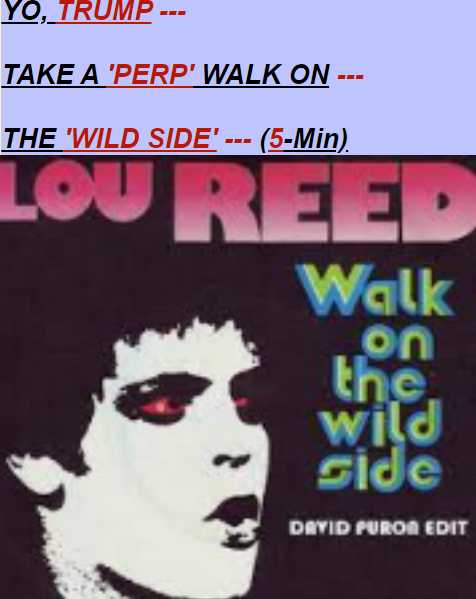 RuFF–RydRR — OUR “618th” PODCAST — “YO, TRUMP — TAKE A ‘PERP’ WALK — ON THE ‘WILD’ SIDE!” —> (“4”-Min.) — (11-8-23) November 9, 2023November 9, 2023 by Paul-Revere-Rides, posted in Political Blog Posts . . FOR ‘ALL’ OUR — ‘SHORT’ PODCASTS — ‘CLICK’ ON –> https://newsblur.com/site/9091742/ruffrydrrradioshort-podcasts-for-those-who-despise-trump-the-fetid-gop . To “PLAY” OUR ‘CURRENT’ PODCAST — (CLICK ON THE — “AUDIO-BAR” — BELOW. . Share this: Click to share on Bluesky (Opens in new window) Bluesky Click to share on Threads (Opens in new window) Threads More Click to share on LinkedIn (Opens in new window) LinkedIn Click to share on Facebook (Opens in new window) Facebook Click to share on Tumblr (Opens in new window) Tumblr Click to share on Pinterest (Opens in new window) Pinterest Click to share on Reddit (Opens in new window) Reddit Click to share on X (Opens in new window) X Like Loading... Related