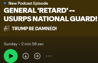 “GENERAL ‘RETARD’ — USURPS NATIONAL GUARD!” — OUR 741st PODCAST — (“3”-Min.-LONG) — JUNE 8TH, 2025 June 8, 2025 by Paul-Revere-Rides, posted in Political Blog Posts Our 741st PODCAST — “3”-Minutes — For ‘PLAY’ — ‘Click’ On ‘Audio’ Bar BELOW Share this: Click to share on Bluesky (Opens in new window) Bluesky Click to share on Threads (Opens in new window) Threads More Click to share on LinkedIn (Opens in new window) LinkedIn Click to share on Facebook (Opens in new window) Facebook Click to share on Tumblr (Opens in new window) Tumblr Click to share on Pinterest (Opens in new window) Pinterest Click to share on Reddit (Opens in new window) Reddit Click to share on X (Opens in new window) X Like Loading... Related