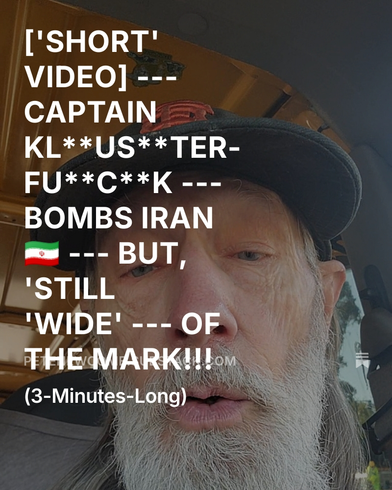[“4”-MIN.-VIDEO] – TRUMP — ONLY — ‘OBLITERATED’ — HIMSELF — SAYS IRAN — [‘Click’ On URL ‘Link’ — Down BELOW] June 25, 2025June 25, 2025 by Paul-Revere-Rides, posted in Political Blog Posts https://open.substack.com/pub/petenewcome/p/short-video-captain-kluster-fuck?utm_source=share&utm_medium=android&r=1275nq Share this: Click to share on Bluesky (Opens in new window) Bluesky Click to share on Threads (Opens in new window) Threads More Click to share on LinkedIn (Opens in new window) LinkedIn Click to share on Facebook (Opens in new window) Facebook Click to share on Tumblr (Opens in new window) Tumblr Click to share on Pinterest (Opens in new window) Pinterest Click to share on Reddit (Opens in new window) Reddit Click to share on X (Opens in new window) X Like Loading... Related